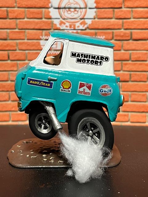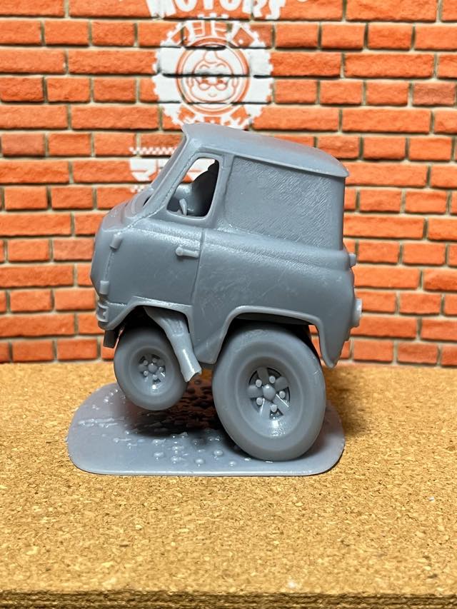 フロントをアップしてウィリーする姿は躍動感満載で、立体表現するときによく使う、土台とタイヤ・フレームを一体化して表現させております。